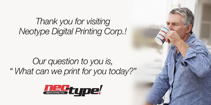 With over 30 years in the printing industry NEOTYPE DIGITAL PRINTING is more than qualified to do any and all the print jobs you require. While we have experience in all aspects of "old school" printing and graphic arts, we remain dedicated to the exciting new technology of 2015 and beyond.